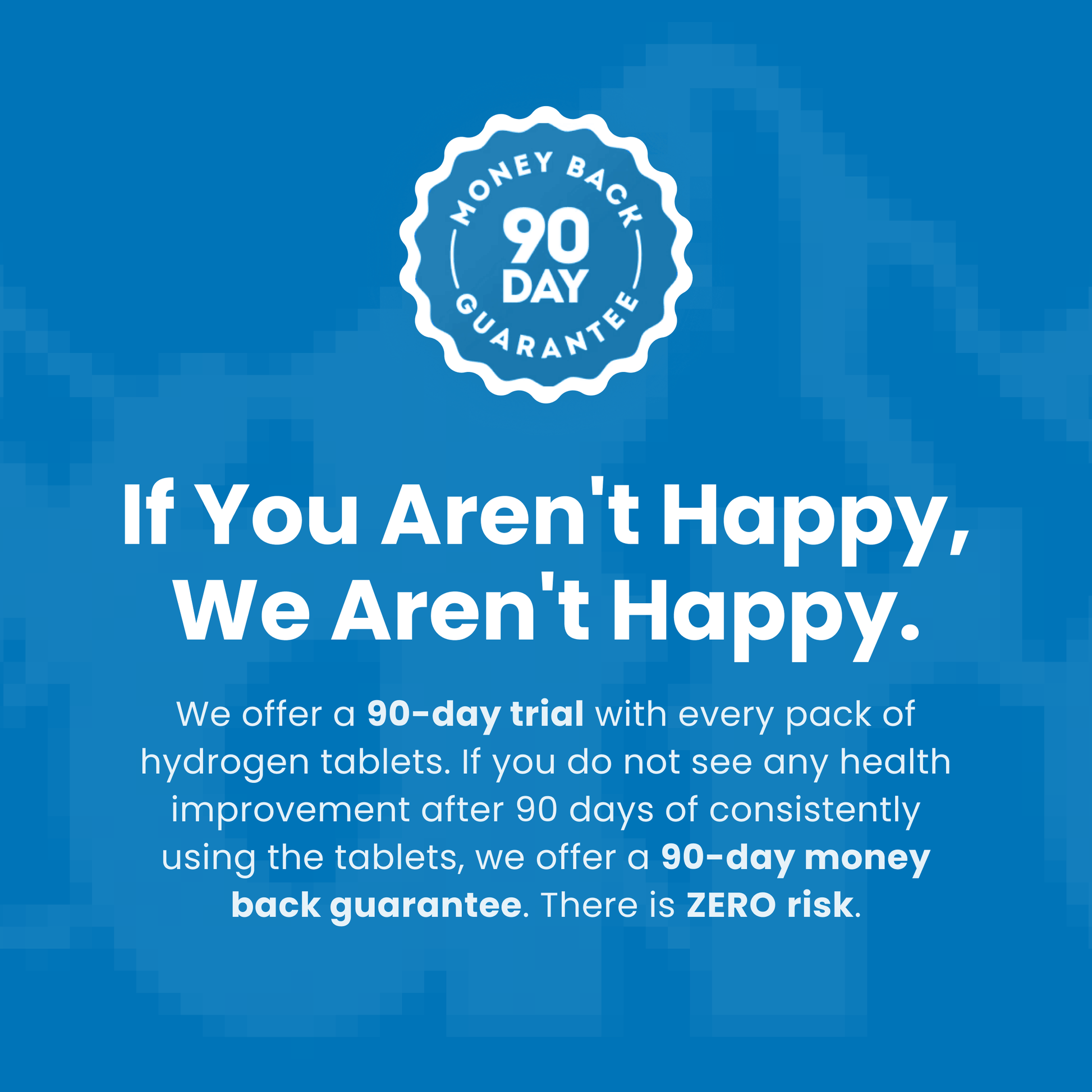If you do not see any health improvement after 90 days of consistently using our hydrogen water tablets, we offer a 90-day money back guarantee. There is ZERO risk.